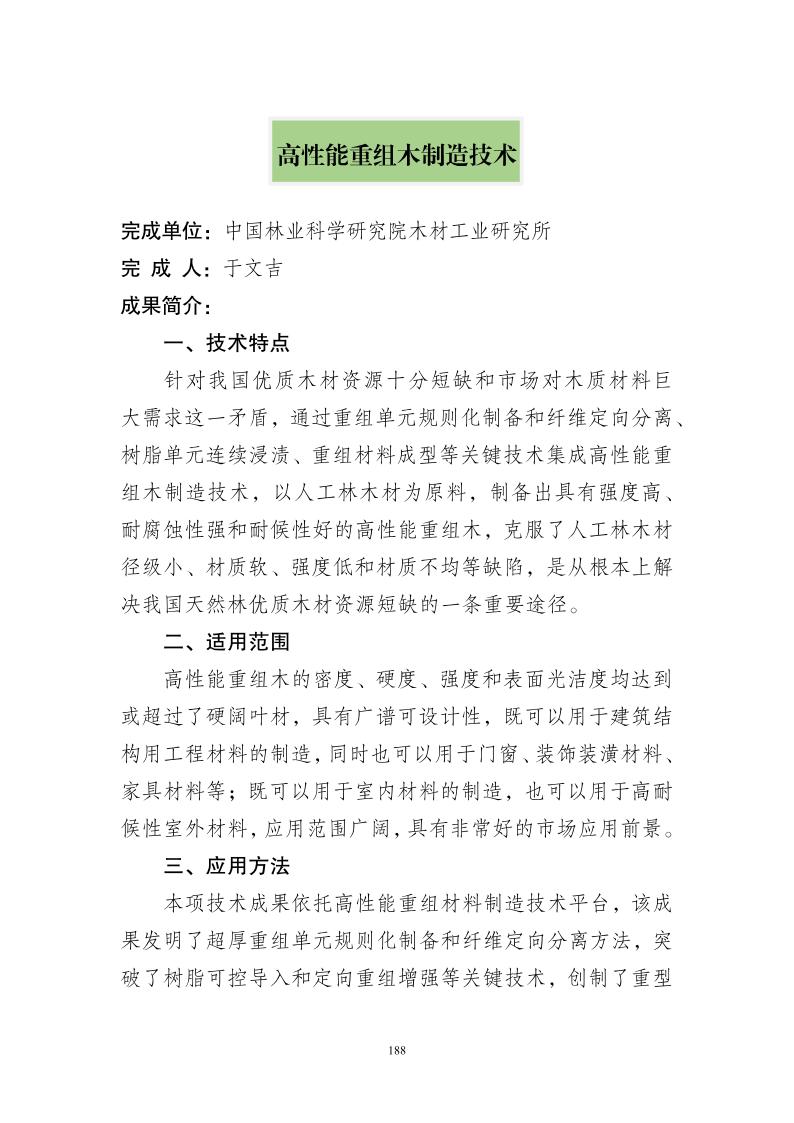 近日,为全面落实深化集体林权制度改革任务,切实发挥先进实用技术对集体林区兴林富民的促进作用,国家林业和草原局聚焦林木良种、森林经营、林下经济、木本粮油、林业机械、木竹加工、林产化学、信息监测等 8 个领域,组织遴选出集体林权制度改革重点推广科技成果 73 项。于文吉首席科学家团队“高性能重组木制造技术”和“大规格耐候性竹质重组结构材制造技术”2项科技成果入选。